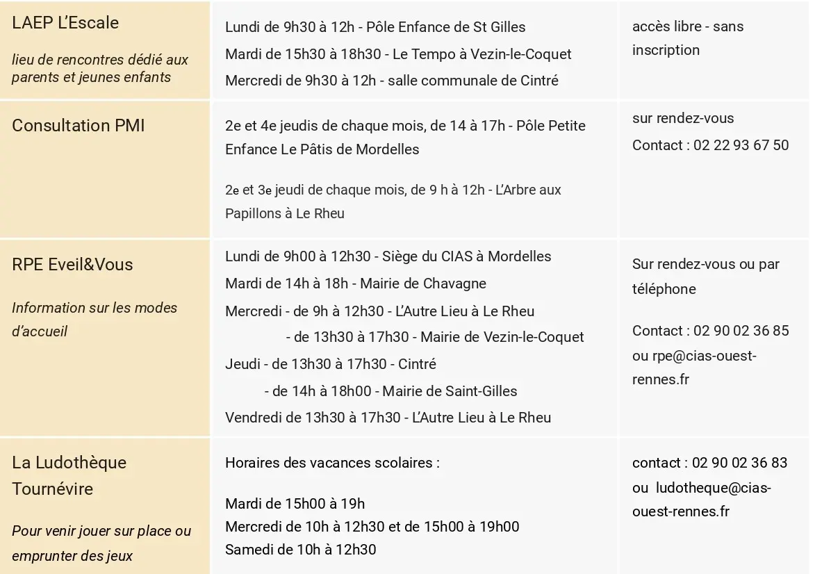 Lieu de rencontre, en accès libre et anonyme. Cet espace est dédié aux parents et à leurs enfants âgés de moins de 4 ans pour des temps de jeux, de détente et d'échange avec d'autres familles, dans un cadre protecteur et rassurant. Pour plus d'informations : https://www.cias-ouest-rennes.fr/pole-petite-enfance/laep/